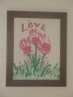 Each season I try to have each of our 3 kids make something for our art gallery. I had thought that February would be a great time to use pinks, reds...and love. Well of course Baby didn't argue and Big Sis was in agreement but Little Guy said he didn't like pink or love. He agreed to use "tractor color" (green), and red. He even used his tractor to make the green part of the painting, by driving it in the paint and then on his paper.